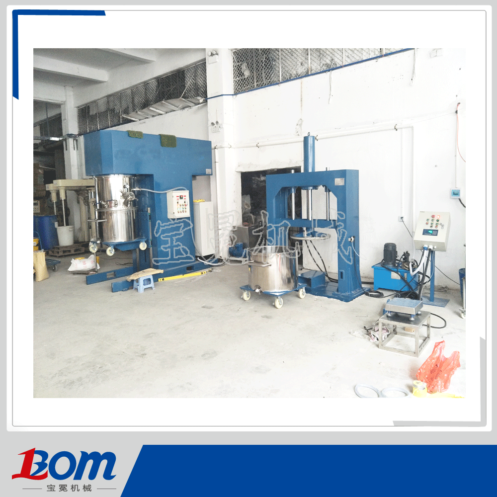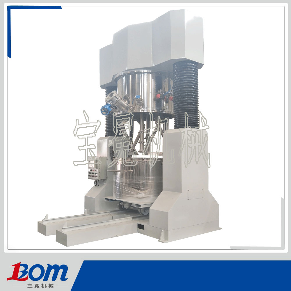 大型雙行星真空攪拌機是寶冕企業針對鋰電池漿料、各種膠黏劑以及新能源行業對于高粘度物料攪拌需要提高攪拌效率和均勻度等基礎上所研制的一種非標化程度高的強力混合攪拌工業級設備。由低速攪拌器、高速分散器、刮壁刮底和測溫探頭等組成,具有快速的混合、反應、分散、溶解,捏合作用,特別適用于固-液、液-液相的分散、混合;根據物料粘度的不同,設計不同的行星輪傳動比,扭矩變化區間大,是膠黏劑、硅膠、鋰電池漿料等行業首選攪拌混合產品;同時設備帶刮壁刮底功能,無死角,無殘留,清洗方便,配套獨特的控制系統,操作安全便捷;設備可另選配擠出裝置,實現攪拌、出料一體化作業。對于有溫度要求的物料,可配套合適的模溫機,獨立操作,溫度控制精度高。